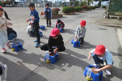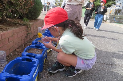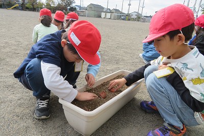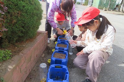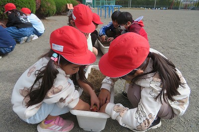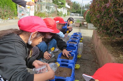 1年生が、11月に、アサガオが植えてあった植木鉢に、球根を植えました。