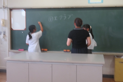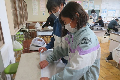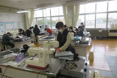 でき上がったエプロンを宿泊学習の野外調理で使うことも、目標にしていたので、みんなで教え合いながら作ることができました。