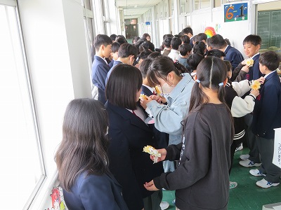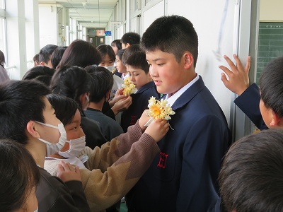 5年生にお祝いの花を付けてもらいました。