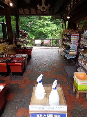 茶屋の真ん中が通路で、右がお土産売り場で左が茶屋の座席となっていますので、中央だけを通って見学してきます。尚、見学する前に手指消毒をします。