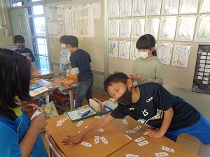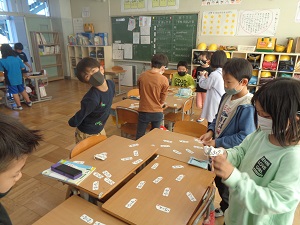 その後は「大きいほうがかち」ゲーム、「九九ビンゴ」をしました。単純なゲームですが子供たちは作戦を立てたり、ビンゴになると大喜びしたりと盛り上がっていました。