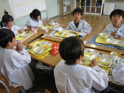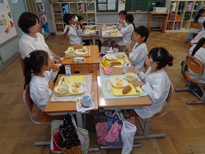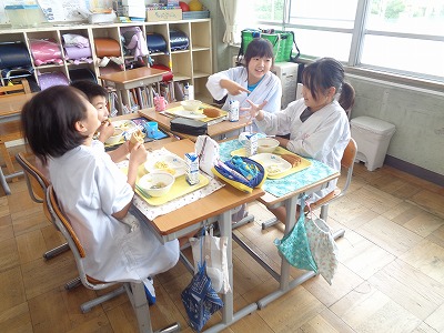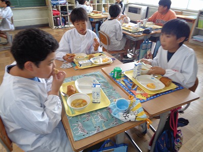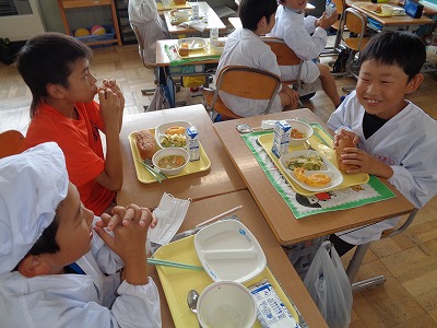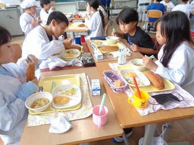 本郷小では、7月から、週に一度のパンの日は、グループで給食を食べることにしました。