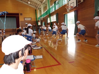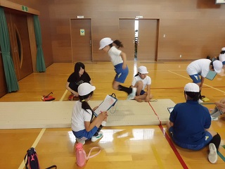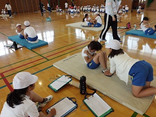 今日は2時間目から4時間目を使って、「新体力テスト」を実施しています。以前の「スポーツテスト」です。今日実施する種目は「ソフトボール投げ」「上体起こし」「反復横跳び」「立ち幅跳び」「長座体前屈」の5種目です。暑さに負けないよう、水筒を持参しています。