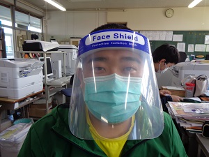 先生たちは、みなさんに安心して学校に来ていただきたいと思い、マスクだけでなくフェイスシールドを買ってみました!