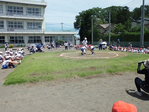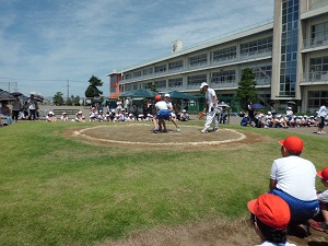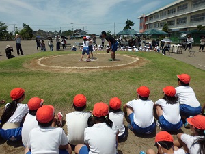 さわやかな晴天のもと、今日は校内相撲大会です。1年生から6年生が一緒の縦割り班による団体戦です。1年生から6年生まで男女12人が同学年ごとに対戦します。白熱した取り組みに応援の保護者の方も見入っていました。