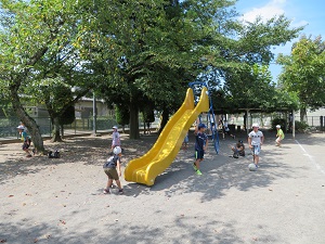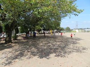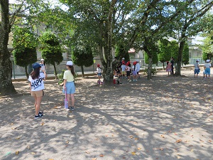 熱中症注意喚起の旗が「黄色」でしたので、子供たちは休み時間に木陰で遊んでいました。木陰に吹く風は、爽やかです。少しずつ秋が近づいているのですね。