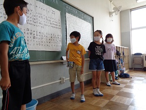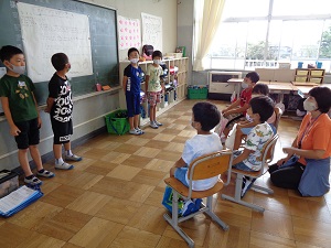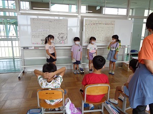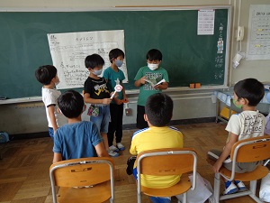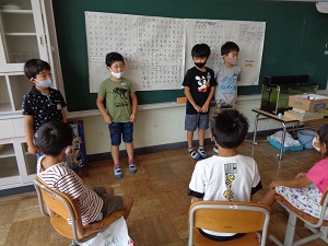 次にグループごとに発表をしました。どのグループも練習の時より上手に発表し、1年生も喜んでくれました。生きものランド大成功です。