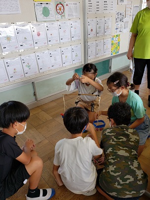 ③最後の写真は、算数の「重さ」の授業です。天秤を使って、重さはもとになる重さのいくつ分で表すことができることを学んでいます。