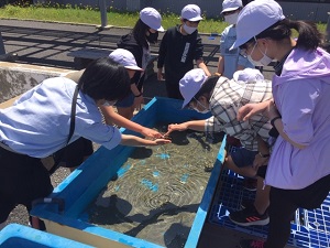 タイやヒラメに餌をあげたり、ナマコやヒトデを触ったりしました。