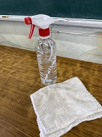 放課後に教室の机やいす、出入り口など、みなさんが手をたくさん手をふれる場所の消毒をしています。