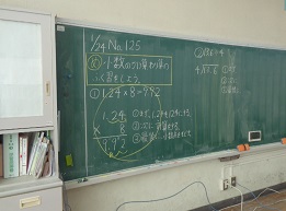 算数のオンライン授業では、「小数のかけ算・わり算」の復習を行いました。問題の手順を全員で確認してからは個人個人で問題を解いていきました。難しい時には、「先生、○番の解き方を教えてください。」と質問をして、黒板を使って説明をしました。