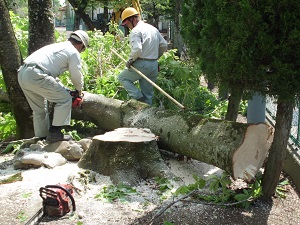 校庭南側のトチノキ、イチョウを伐採しました。校地南西角の交差点の見通しをよくするのと、近隣への落ち葉の飛散を考えての処置です。少し校庭の景色がさびしくなりました。