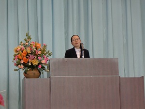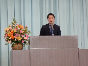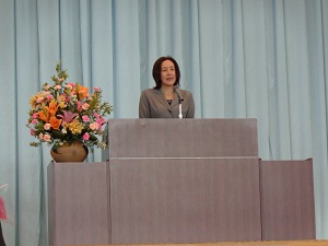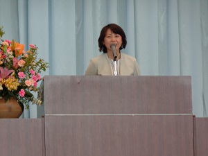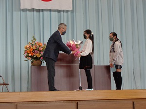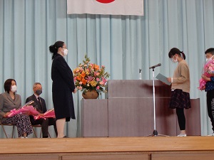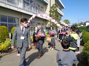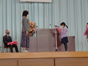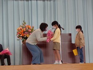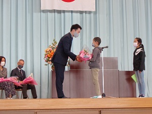 校長先生から先生方の紹介をしていただいた後、代表児童が作文を読んだり、花束を渡したりしました。