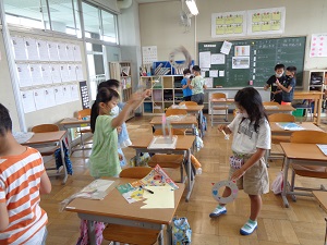 図工では厚紙を使って紙けん玉を作りました。