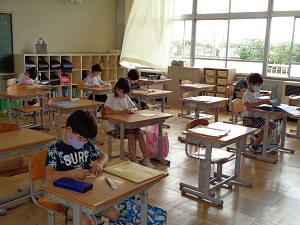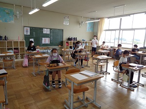 教室でも間隔を保って学習しました。段階的な学校再開です。