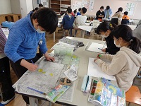 筆やローラーの使い方や版画の技法など、小学校での学習を活用して、それぞれ表現を工夫していました。できあがりが楽しみですね。