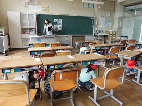 今年第1回」の避難訓練です。まずは地震に対する備えから。「緊急地震警報発令」の放送で机の下に隠れます。