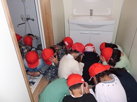続いて竜巻に対する避難訓練。トイレや書庫に逃げ込みます。