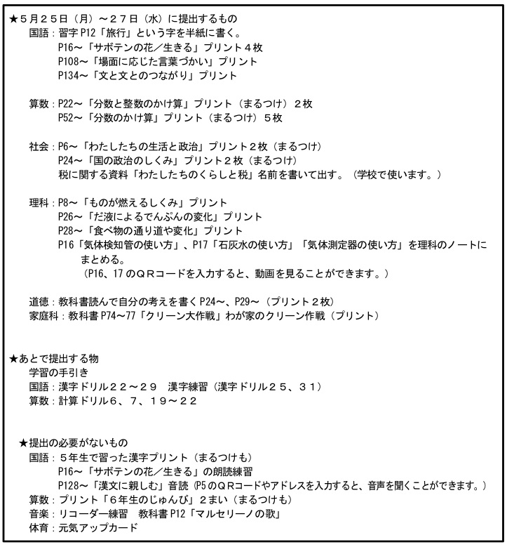 提出する物は、学年だよりを見て確認しましょう。みなさんが家でがんばった成果をみるのが楽しみです。
