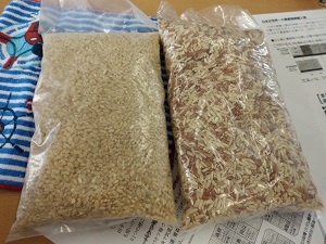 左がジャポニカ種の玄米 右側はインディカ米(長粒種)