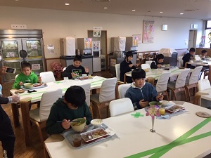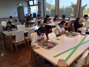 感染症対策が徹底されている中、5年生は約束を守り静かに食事しました。
