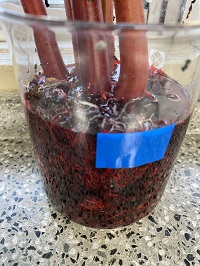 次に、ビーカーに切り花せん色ざいを入れます。今回は赤いせん色ざいを使っています。