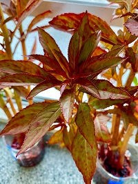 葉までせん色ざいが届き、赤くなっていますね。同じ原理で、白い花に色をつけることもできます。せん色ざいには赤以外にも、青、黄、緑、オレンジなど様々な種類があるので、家で実験してみるものよいのではないでしょうか。