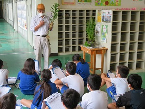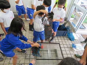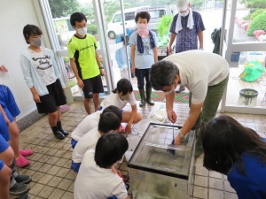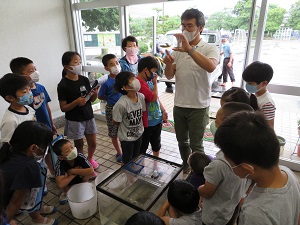 3年生と5年生を対象に、「総合的な学習の時間」で、田の生き物についての学習を行いました。雨のために近くの田に入ることはできませんでしたが、子供たちは、ボランティアの先生方が用意してくださった生き物を熱心に観察していました。