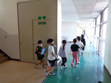 グループに分かれて、音楽室や職員室などを探検します。