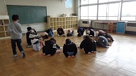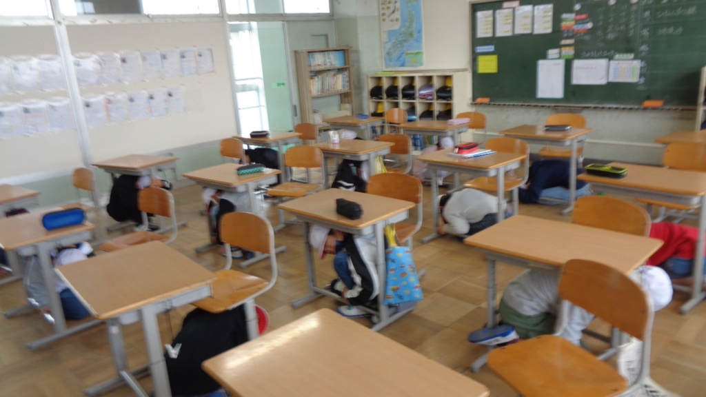 机の下にすぐ隠れ、真剣に避難訓練をすることができました。