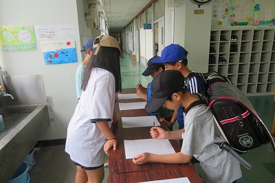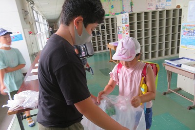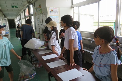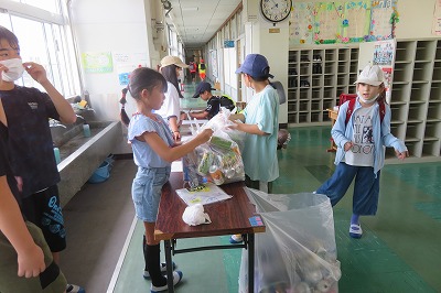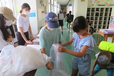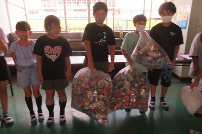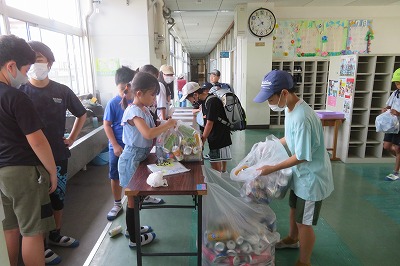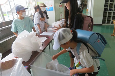 各自持ってきたアルミ缶を昇降口で袋に入れます。