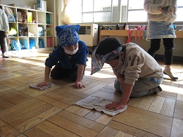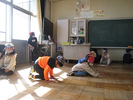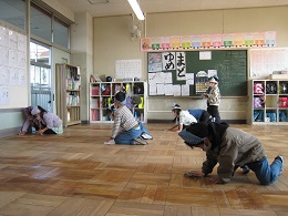 物がなくなった教室を、「ごしごしキュッキュ!」。みんなでしっかり磨きました。