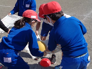 2人1組になり、新聞紙にボールを乗せて走ります。