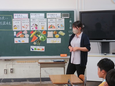 夏休み前に行った「給食についてのアンケート」をもとに、子供たち自ら「バランスのよい給食にする理由を知ろう」というめあてを立てました。
