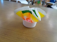 ペットボトルキャップに水を入れ、折った先っぽをつけます。