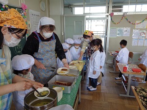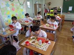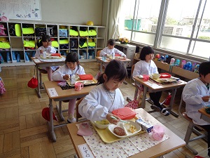 1年生は嬉しそうに準備して、にこにこ静かに食べていました。