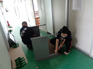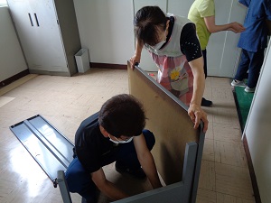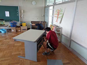 職員作業で、不要になった机や椅子を片付けました。「チーム本郷小」みんなで力を合わせて、スムーズに作業が進みました。総合学習室や資料室が広くなり、より使いやすくなったと思います。