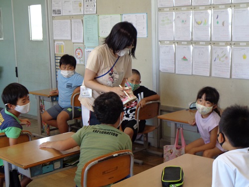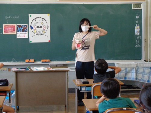 ゲストティーチャーとして養護教諭の竹村先生に来ていただき、むし歯のできかた、むし歯のできやすいところ、上手な歯の磨き方、歯の生え替わりなどについて教えてもらいました。