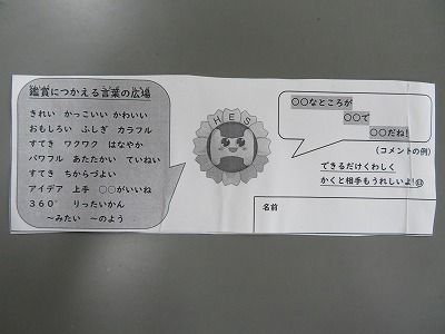 チケットの裏側の言葉を参考にして、友達の作品のいいところを、プリントに書くことができました。