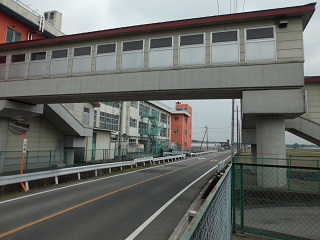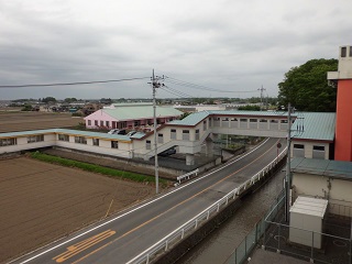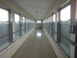 本校校舎1階北側から学校の裏の用水路と県道158号線(下岡本・上三川線)をまたいで延びている工作物。駅の跨線橋にも見えますが、校舎と体育館をつなぐ連絡通路です。