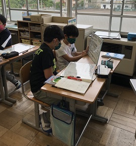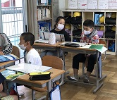 算数の学習では、「わり算の筆算」を学習しています。子供たちは、ノートに考えを書きます。その後、ホワイトボードに友達へ伝えられるようまとめ直し、友達へ伝えます。同じ答えでも、「そういう方法があるんだ。」「そっちの方が分かりやすいね。」と、より解きやすい方法を見つけ合っています。 学習内容もこれまでに比べ、難しくなっています。一つ一つ丁寧に指導していきます。