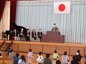 校長先生からお話しのあった「友達と仲良くすること」「目標に向かってあきらめずに頑張ること」「挨拶をしっかりすること」この3つを守ってすばらしい1年にしてほしいと思います。