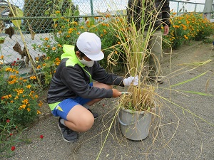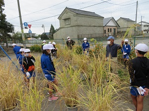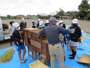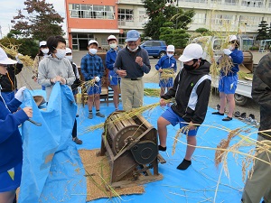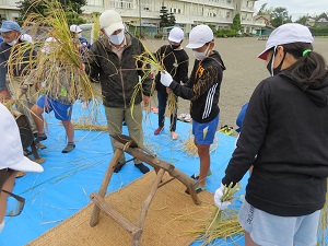 米農家の上野先生のご指導の下、5年生が稲刈りに挑戦しました。稲刈り用ののこぎり鎌を使って稲刈りをした後、唐箕(とうみ)や足踏み脱穀機 、千歯(せんば)こきでの脱穀にも挑戦しました。今年の夏は暑かったので、豊作でした。5年生にとっては、大変貴重な体験ができたと思います。