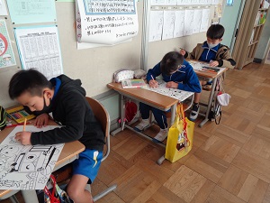 ゆうがおバス絵画コンテスト、ぬりえの部の応募用紙が配付されましたので、学校で塗ってみました。