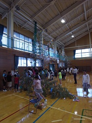 体育館にて、縦割り班ごとに笹に飾りつけを行いました。