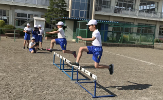 体育では、『ハードル走』の学習をしています。学習の中で、「小型ハードルをテンポよく跳び越える」ことを目標としています。跳び越えたハードルから次のハードルまで、4歩で跳び越えるようにすること、跳ぶ越えるときの姿勢を低くすることを意識して学習してきました。
