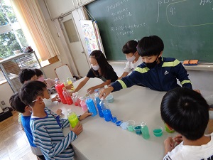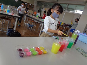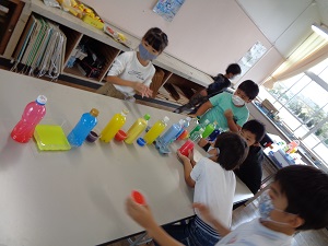 本日の図工の学習は「にじいろコレクション」色水を作ったり並べたりする学習です。