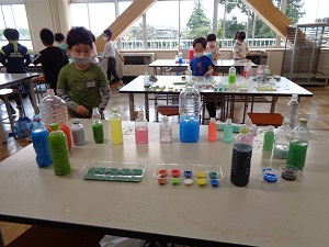 ペットボトルや卵のパック、ゼリーのカップなどに思い思いに色水を作っていきます。
