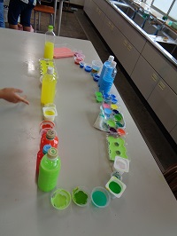 それぞれが色水を作ったところで、グループごとに「美術館みたいに並べてごらん」と声をかけると、自分たちなりに考えながら色水を並べていました。