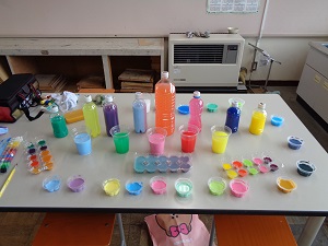 ※台風12号が図工室内にも訪れていたようで?その影響を受けてしまったのか??衣服に色水がついてしまった子たちもいました。申告があった子の服は洗濯してみたのですが、落ちきっていなかったらすみません・・・。